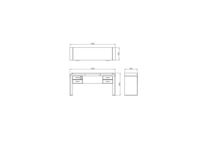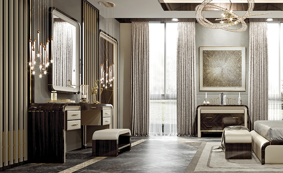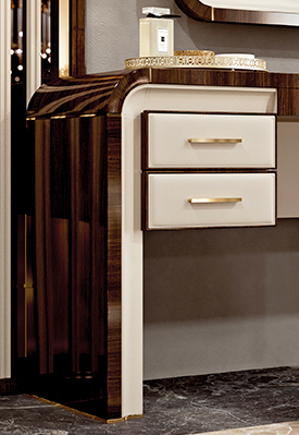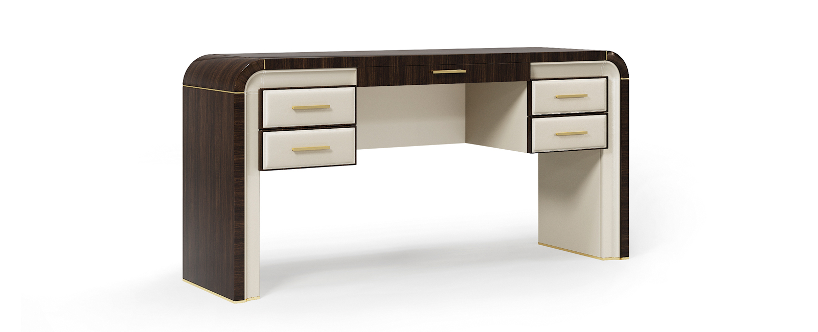 Eucalyptus dressing table w/brass and leather details, w/5 drawers.