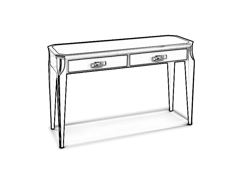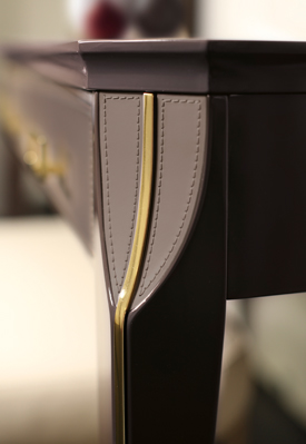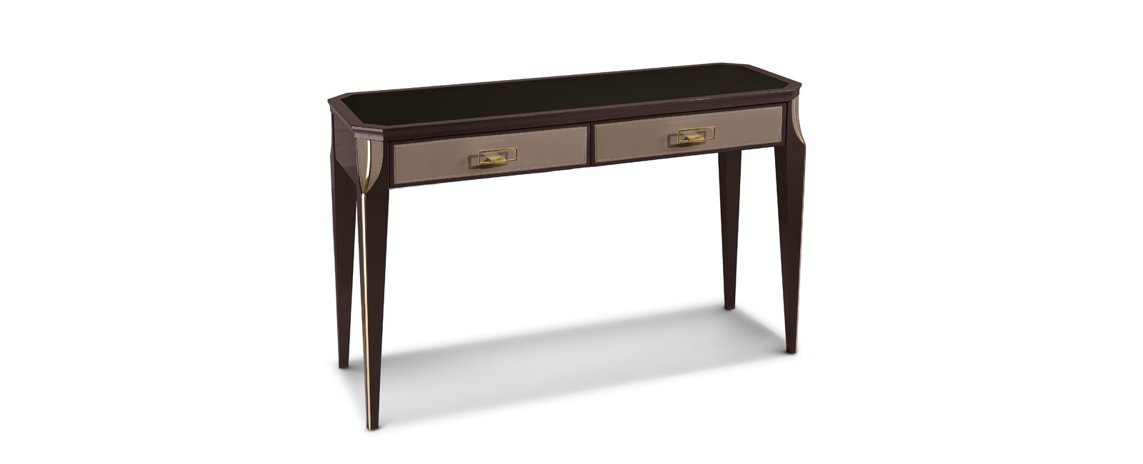 Shiny lacquered console table, w/brass and leather details, w/smoked glass top and 2 drawers with leather.