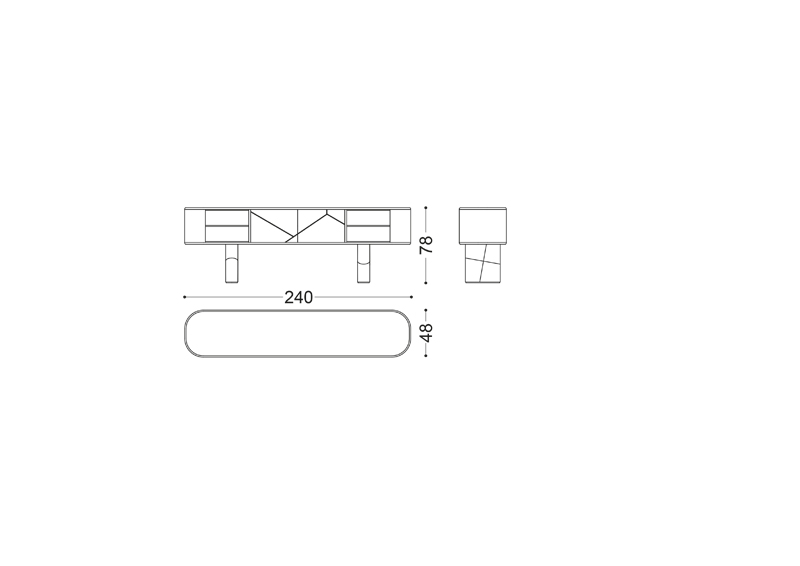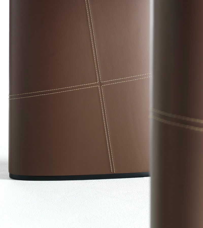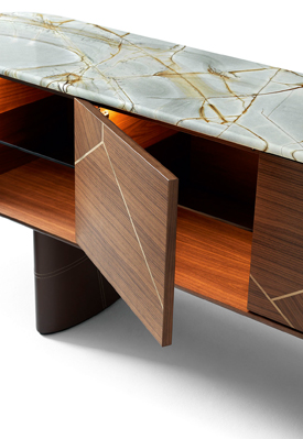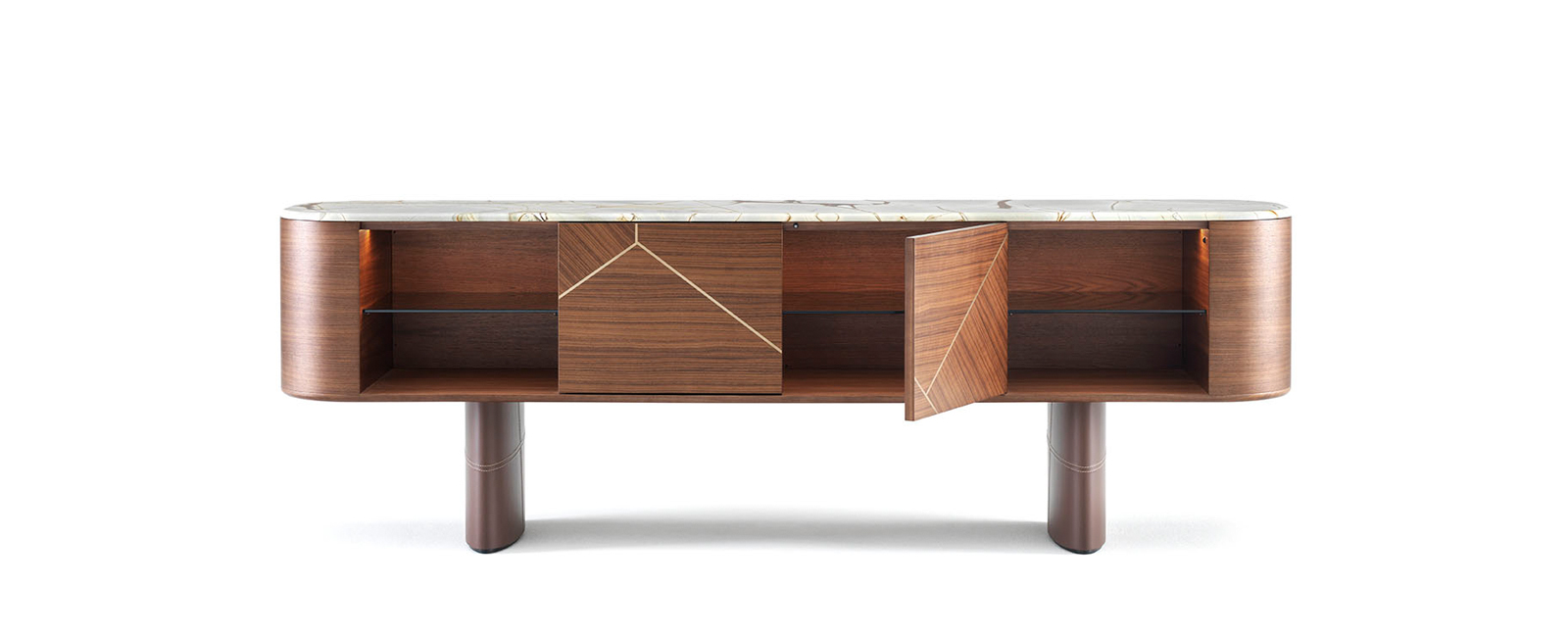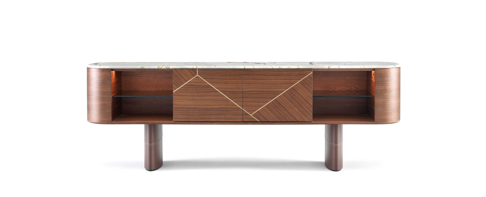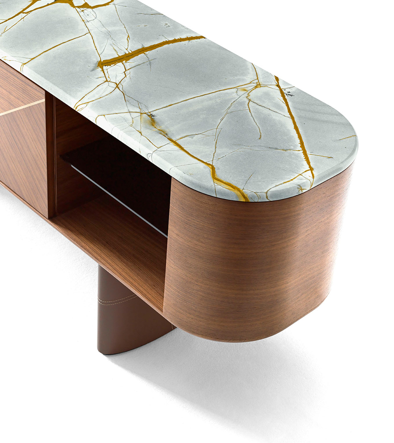 Walnut sideboard with two compartments and two doors with metal inserts, marble top and leather legs.