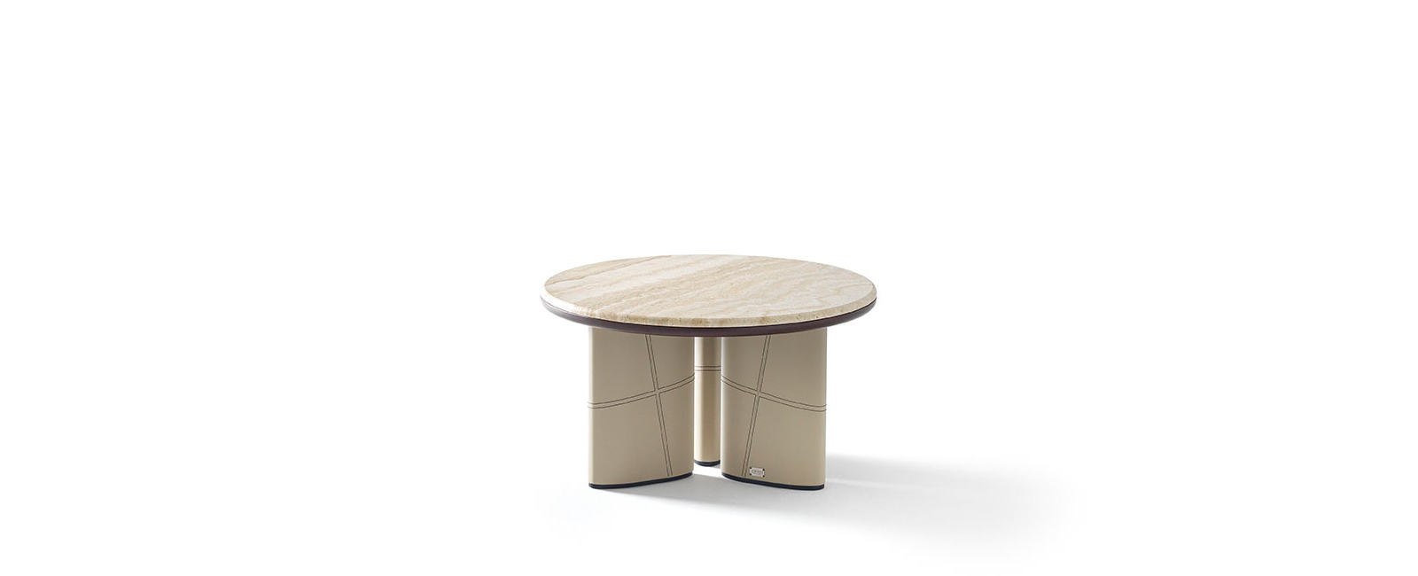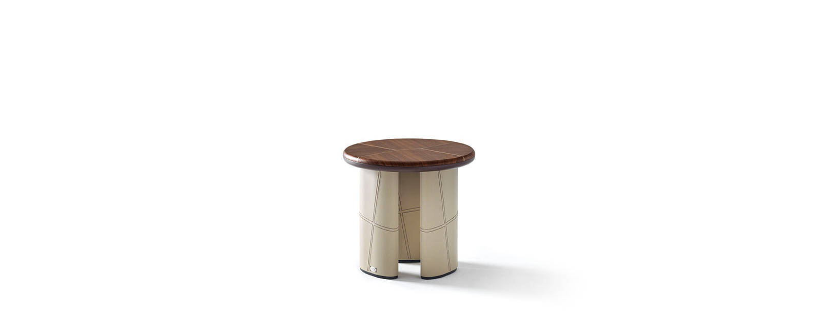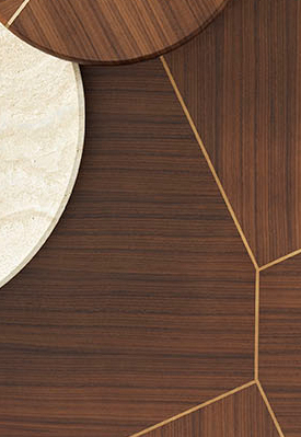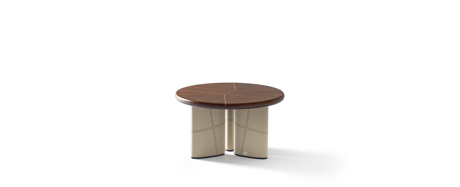 Coffee and side table with canaletto walnut top, metal inserts and leather legs.