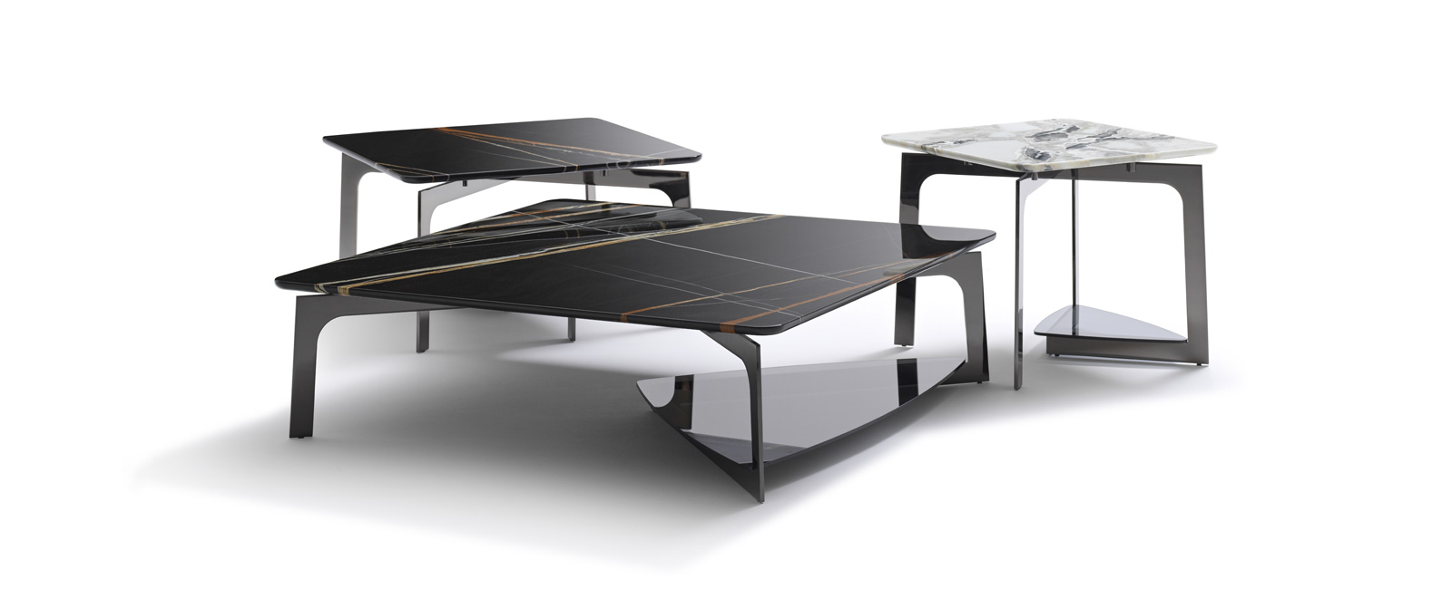 Small tables with structure in polished black nickel, marble top and with smoked glass lower shelf.
