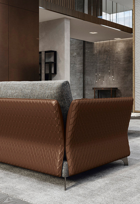 Divano con struttura in abete massello, imbottito a densità differenziate con schienale in piuma d’oca e seduta in poliuretano espanso e memory foam, arricchito da piedini in nichel nero lucido. Rivestimento come foto: tessuto e pelle trapuntata.