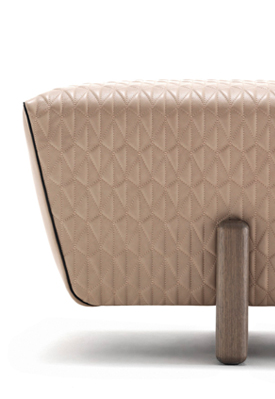 Panchetta con struttura in pioppo massello, imbottitura a densità differenziate, con raffinati piedini in noce canaletto massello. Rivestimento come foto: pelle e pelle trapuntata.