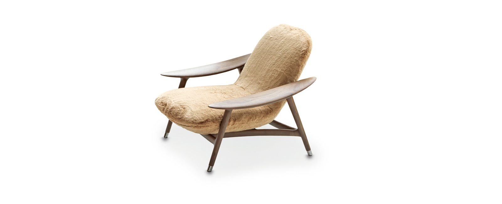 Poltrona in noce canaletto massello, imbottita a densità differenziate, con copri-piedini in nickel nero lucido. Rivestimento come foto: pelle.