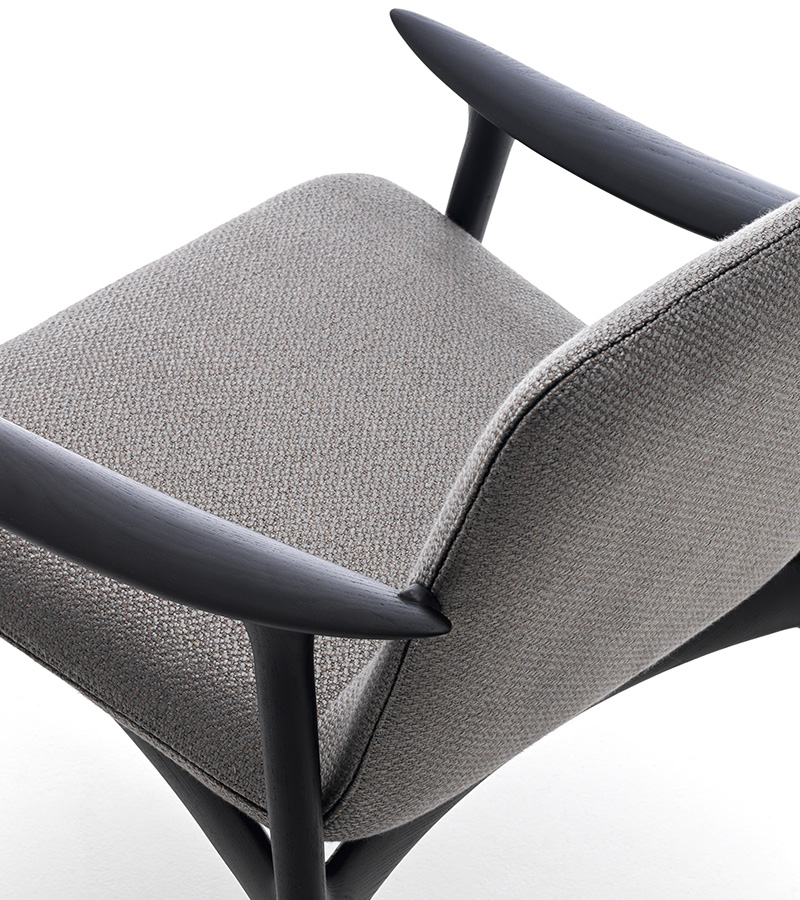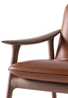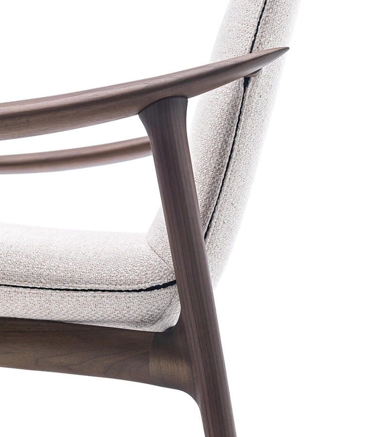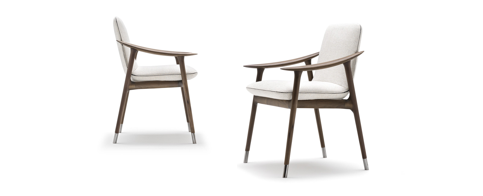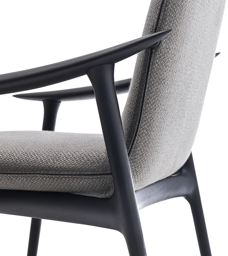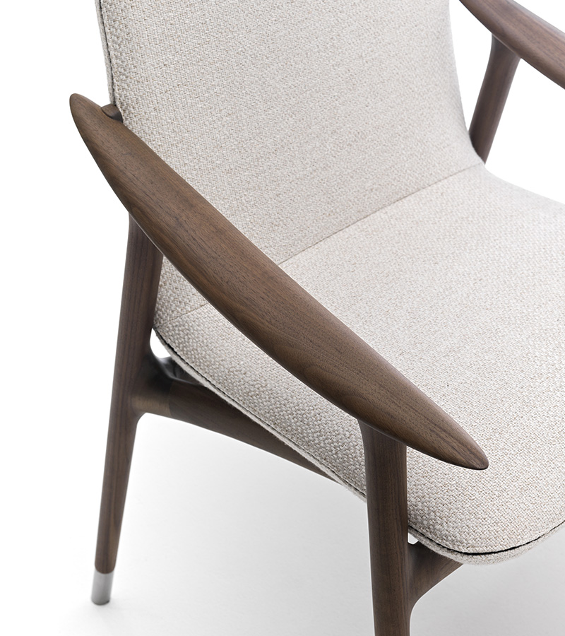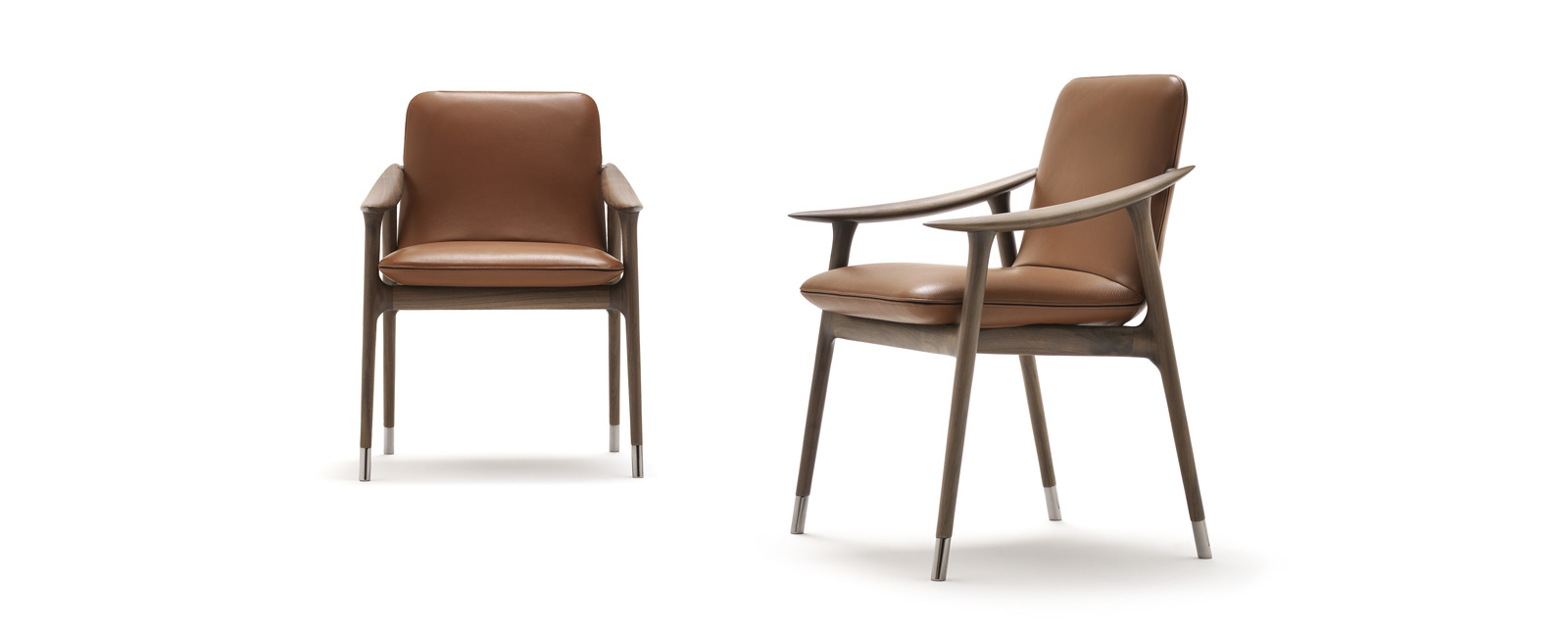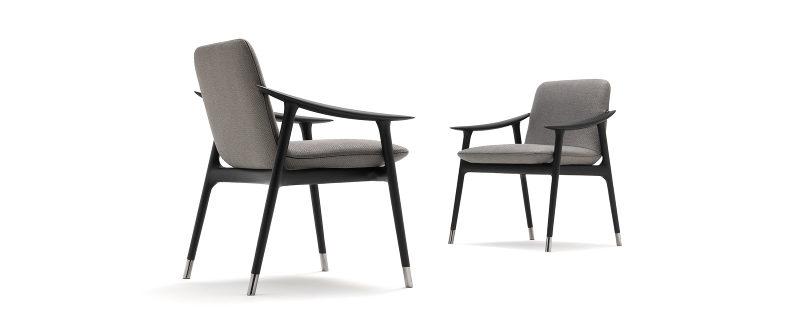 Sedia con braccioli, disponibile con struttura in noce canaletto massello oppure in frassino laccato nero, imbottita a densità differenziate, con copri-piedini in elegante nichel nero lucido. Rivestimento a scelta tra pelle o tessuto.