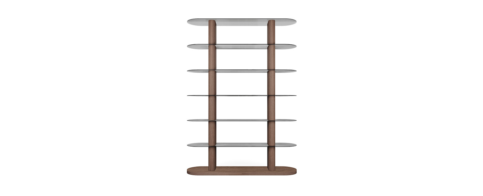 Libreria in noce canaletto, con ripiani in vetro fumè