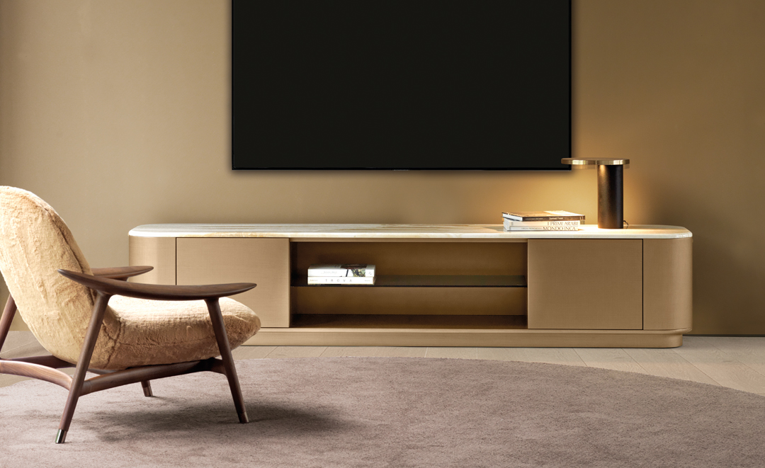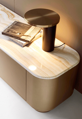 Porta TV con piano in marmo onice ivory, finitura pergamena champagne.