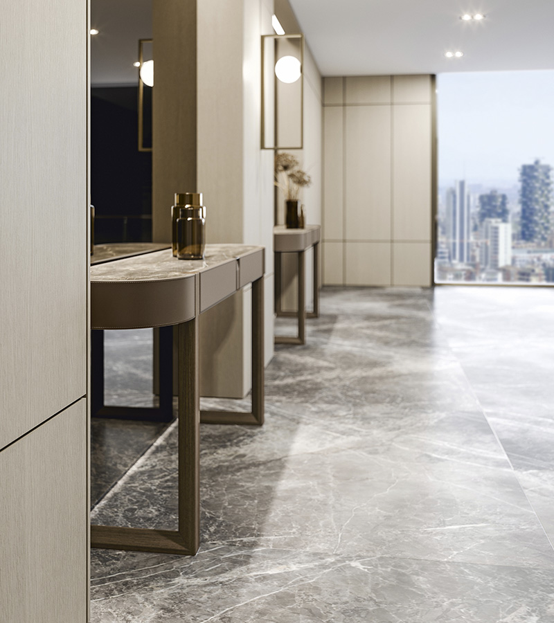 Consolle in noce canaletto massello, piano marmo dover white e rivestimento struttura in cuoietto.