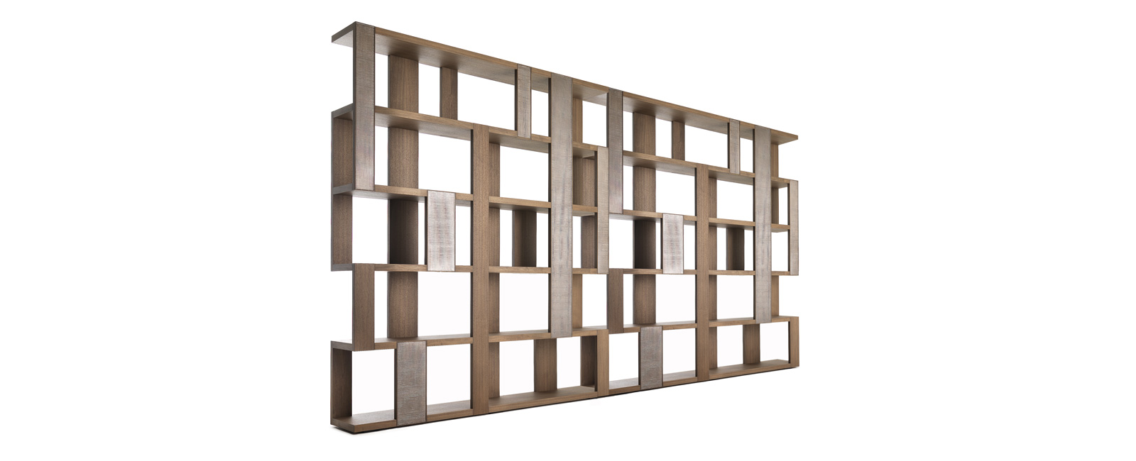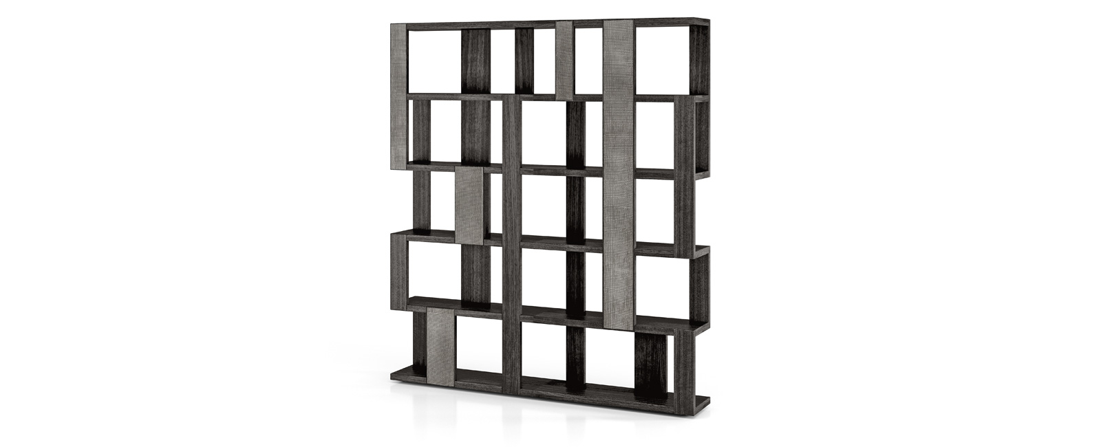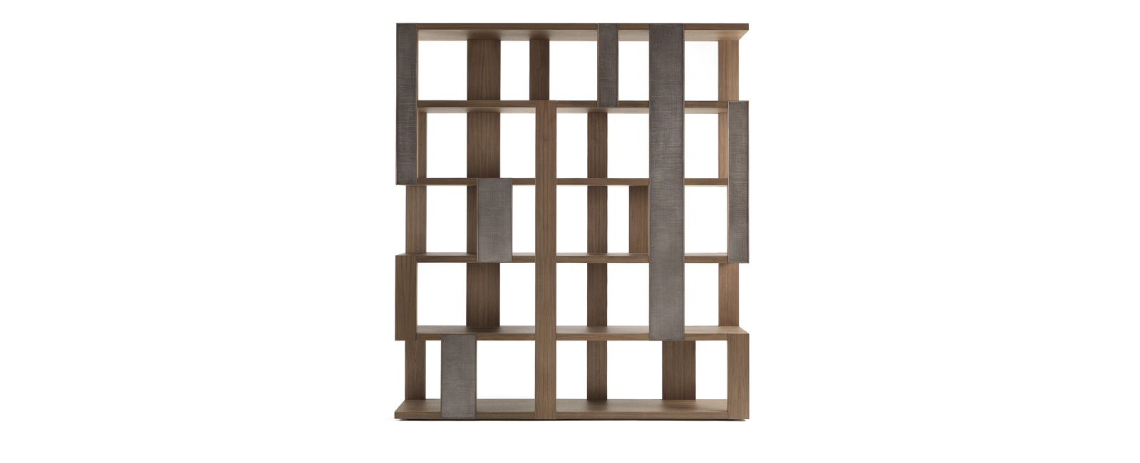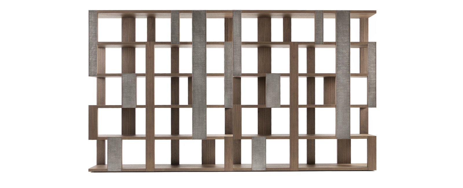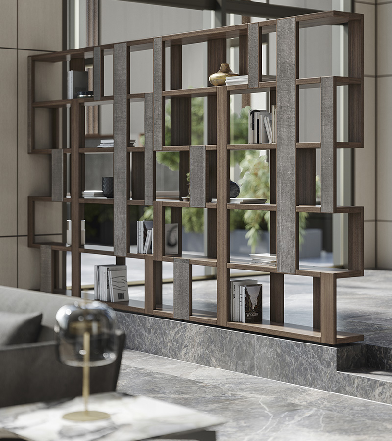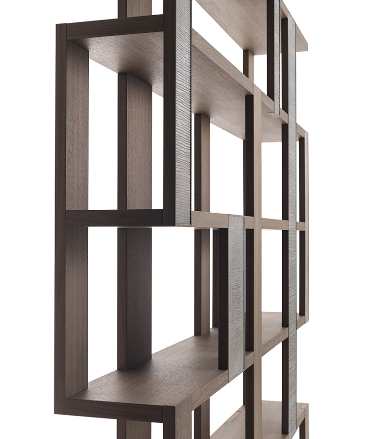Libreria con struttura in noce canaletto massello, disponibile anche in noce canaletto massello scuro con eleganti inserti in laccatura texturizzata effetto metallo.